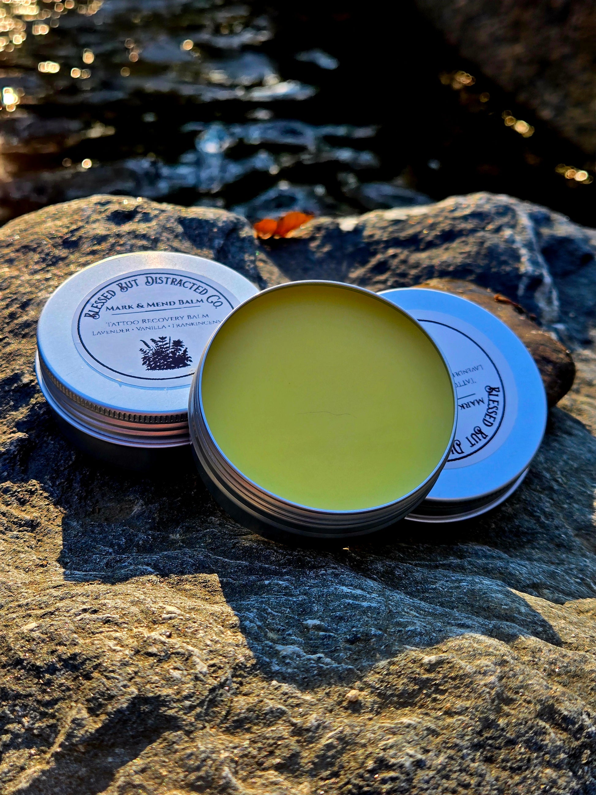 Handcrafted in the Blue Ridge Mountains, Mark & Mend Balm is a gentle, natural tattoo aftercare balm made from grass-fed tallow and slow-infused Appalachian herbs.